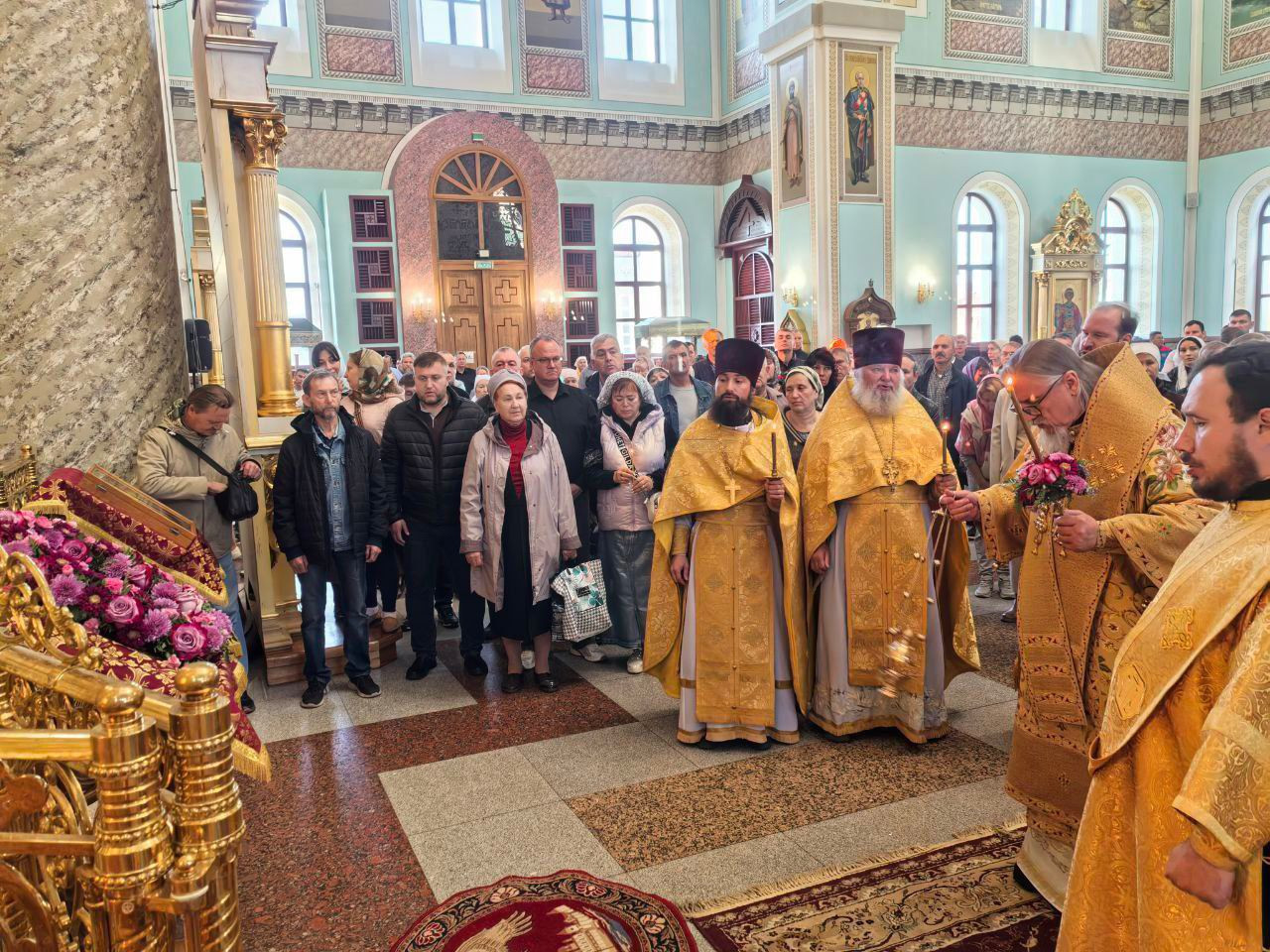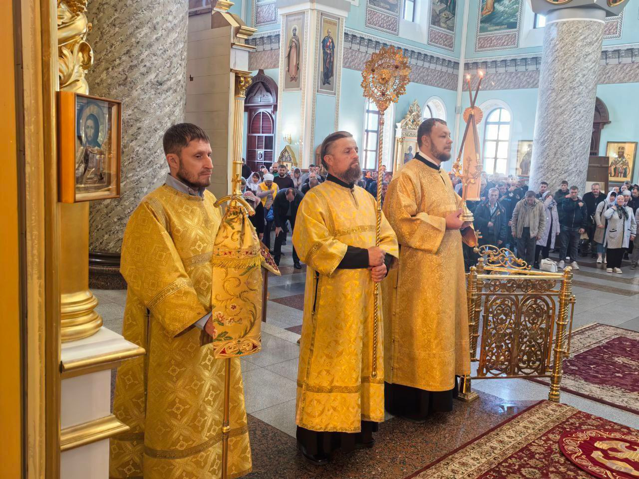 По завершении литургии Владыка с духовенством и прихожанами совершили славление животворящему Кресту Господню.