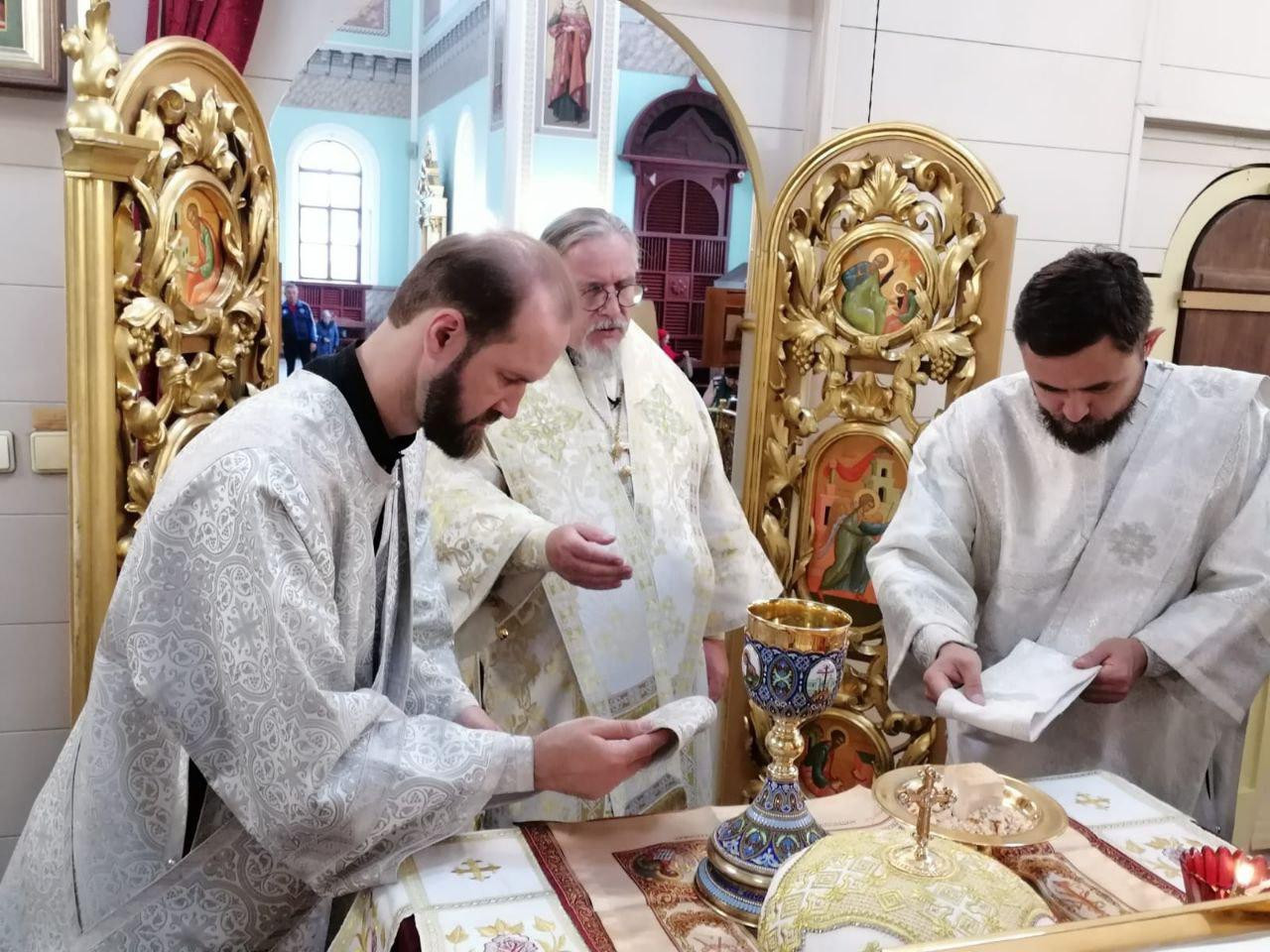 Диаконский чин возглавили: иеродиакон Иннокентий (Фёдоров), диакон Михаил Воробьёв, диакон Дионисий Донской.