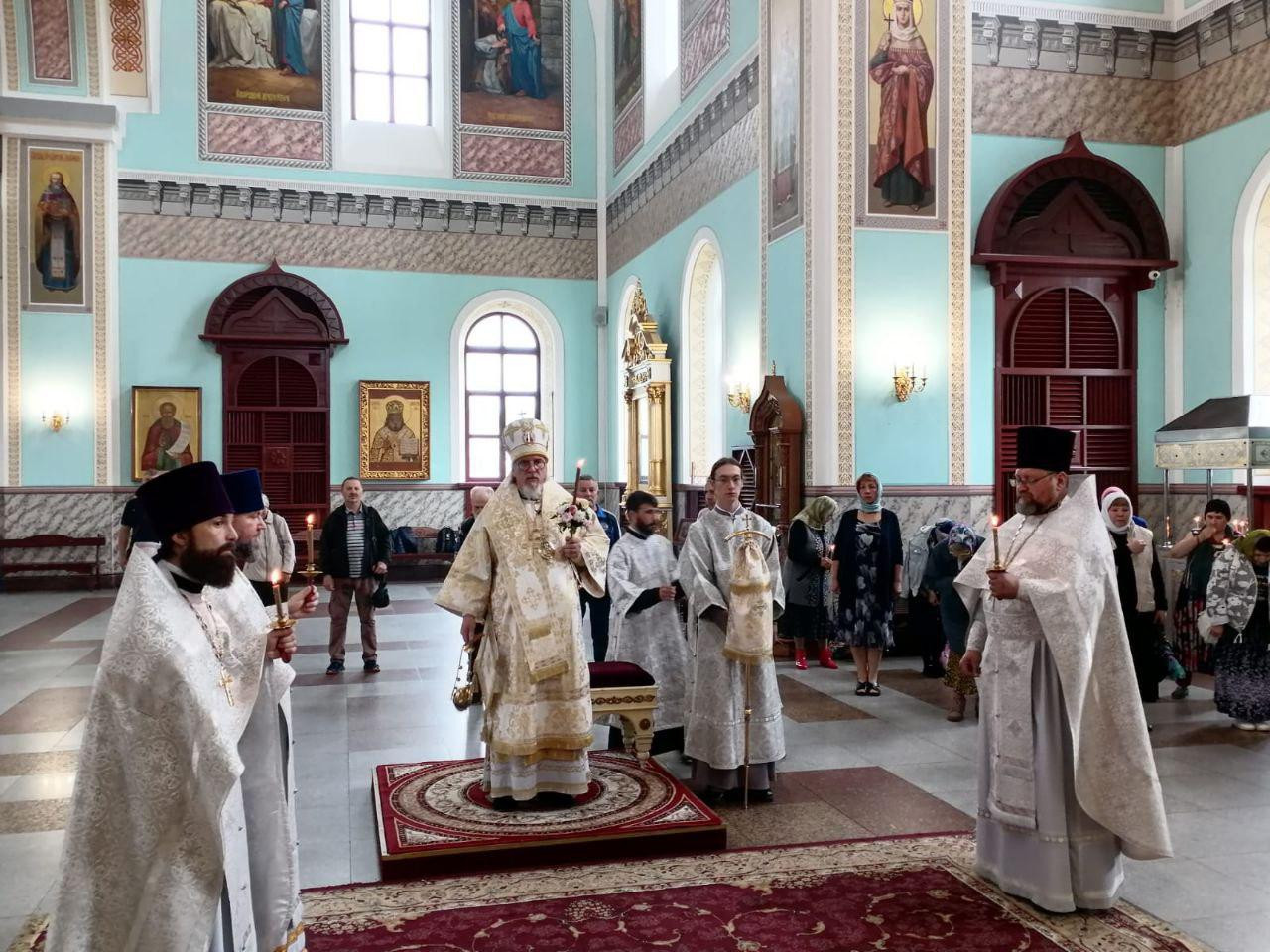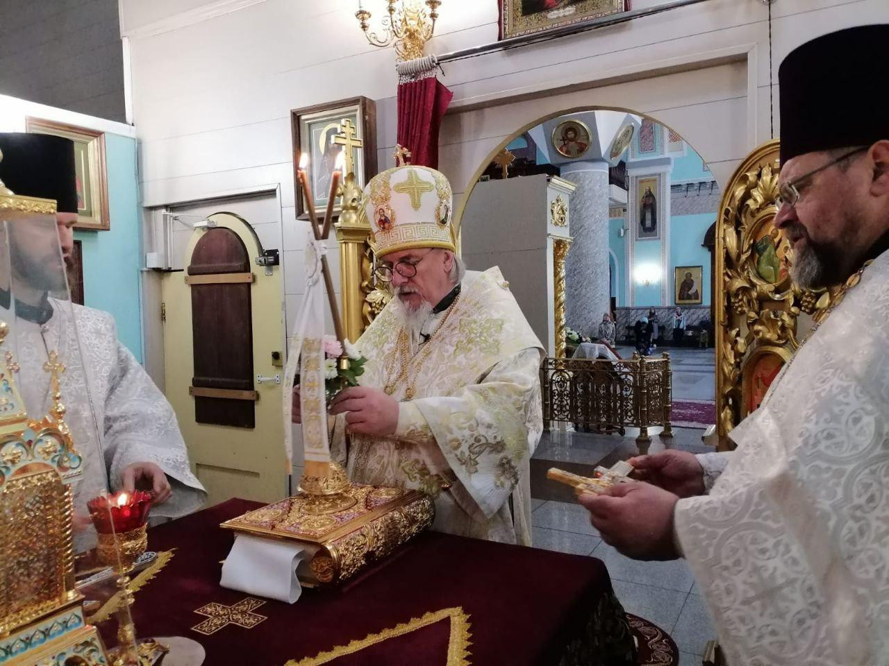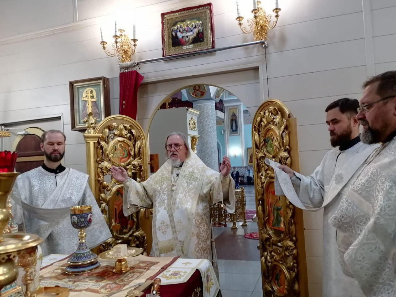 Его Высокопреосвященству сослужили: клирики Казанского кафедрального собора г. Читы — иерей Валерий Шаферов; настоятель храма великомученика Димитрия Солунского г. Читы — иерей Алексий Шаталов; настоятель храма Воздвижения Креста Господня на КСК иерей Алексей Янковский.