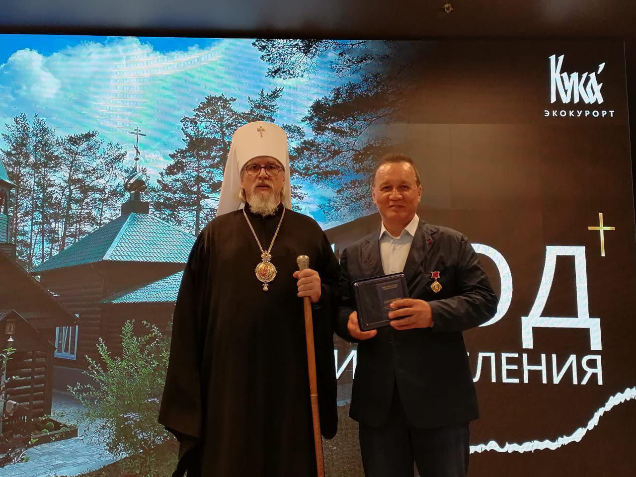 В связи с чем, директор экокурорта «Кука» Сергей Олегович Давыдов поздравил всех гостей с праздником и вручил митрополиту Димитрию благодарственную грамоту за оказание духовной поддержки и благословение на капитальный ремонт храма святого великомученика и целителя Пантелеимона.