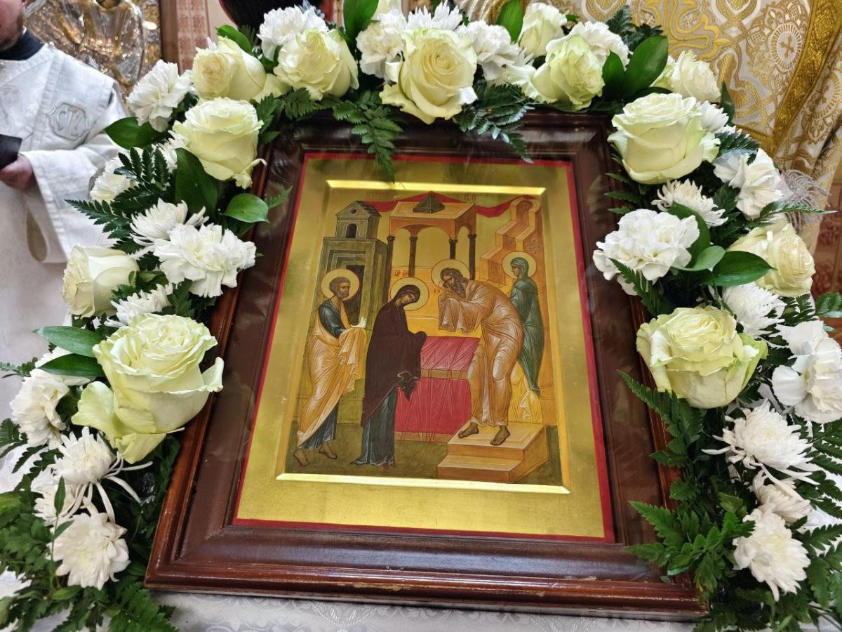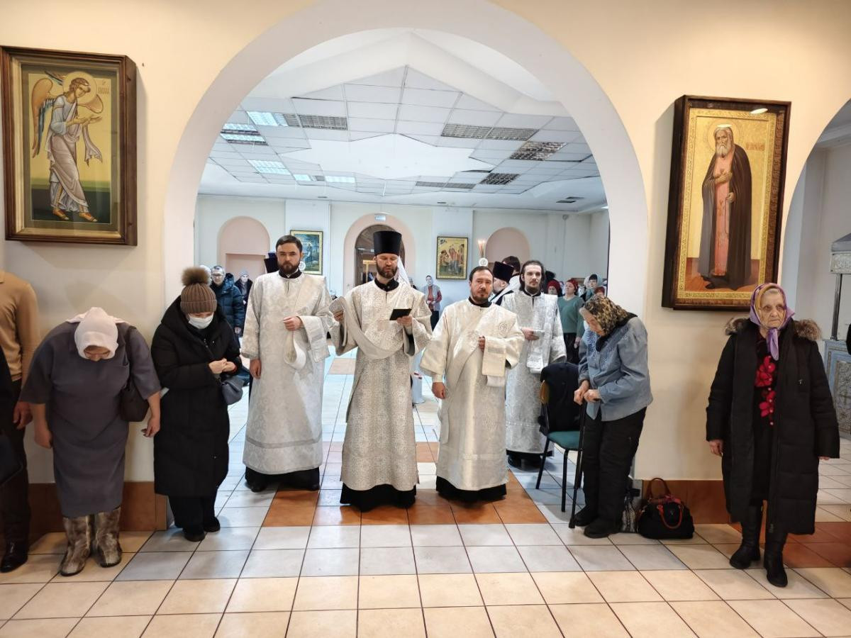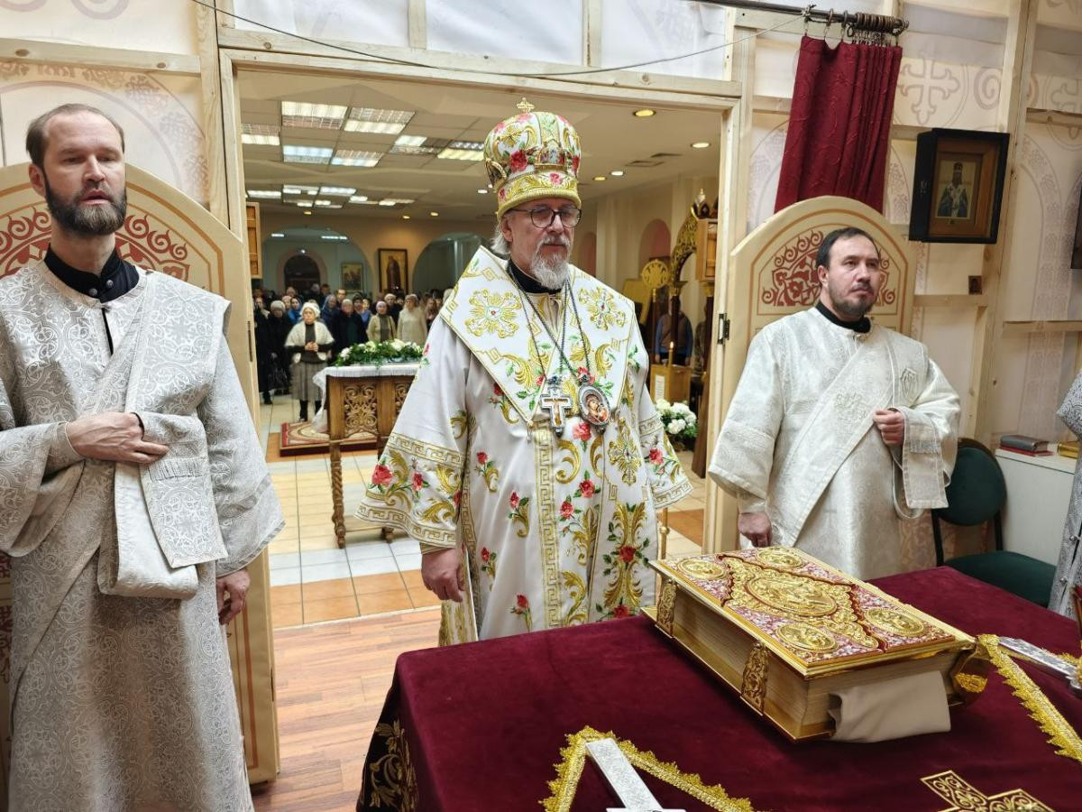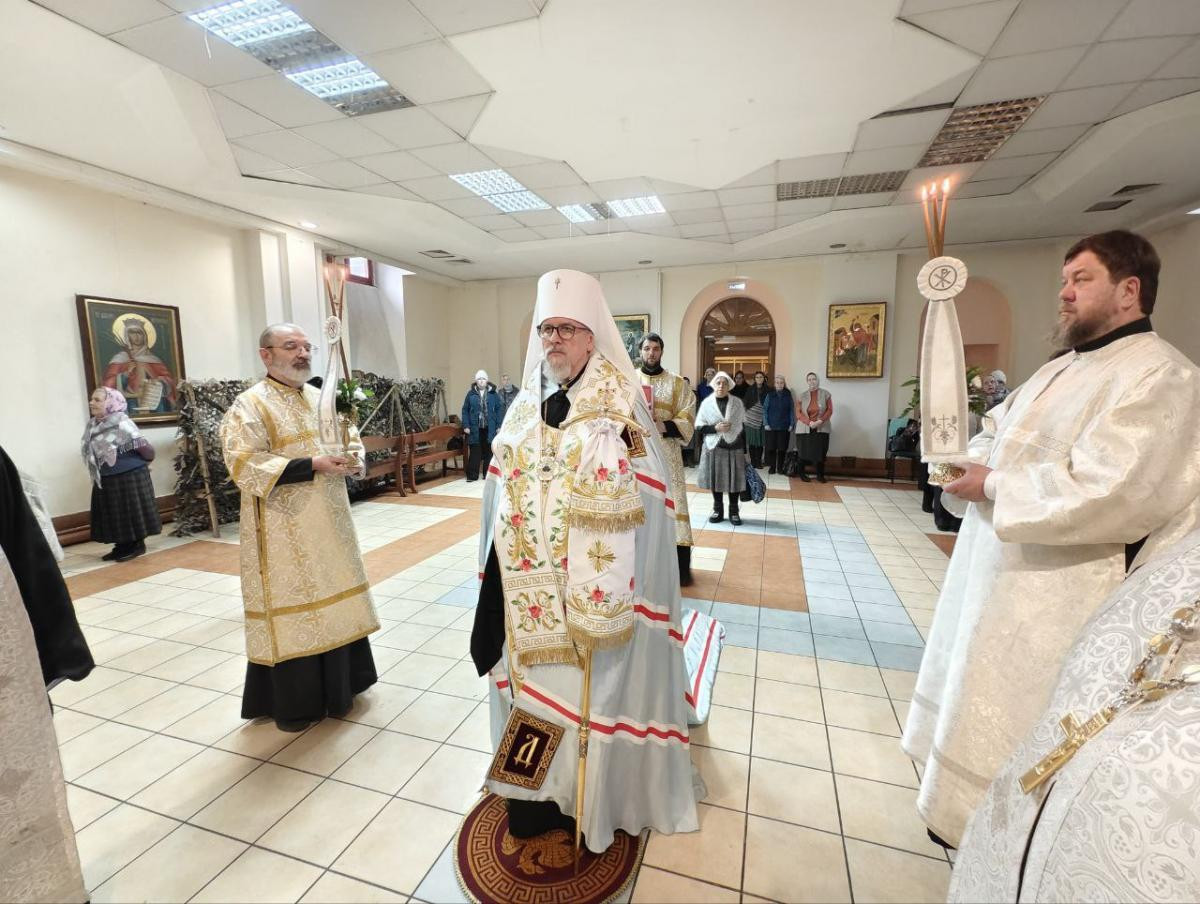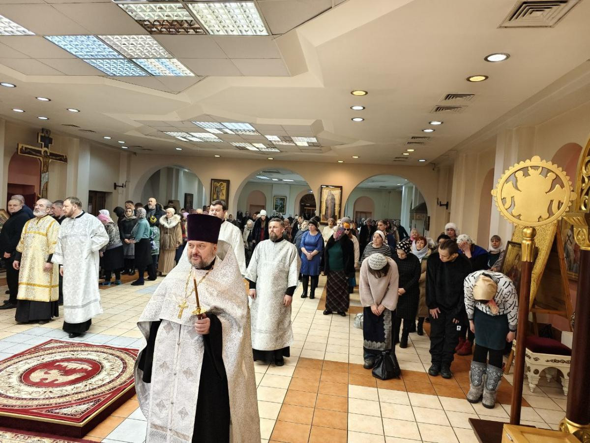 За всенощным бдением были совершены вечерня, лития с освящением хлебов, вина и елея и утреня с чтением Евангелия и помазанием всех молящихся освященным елеем.