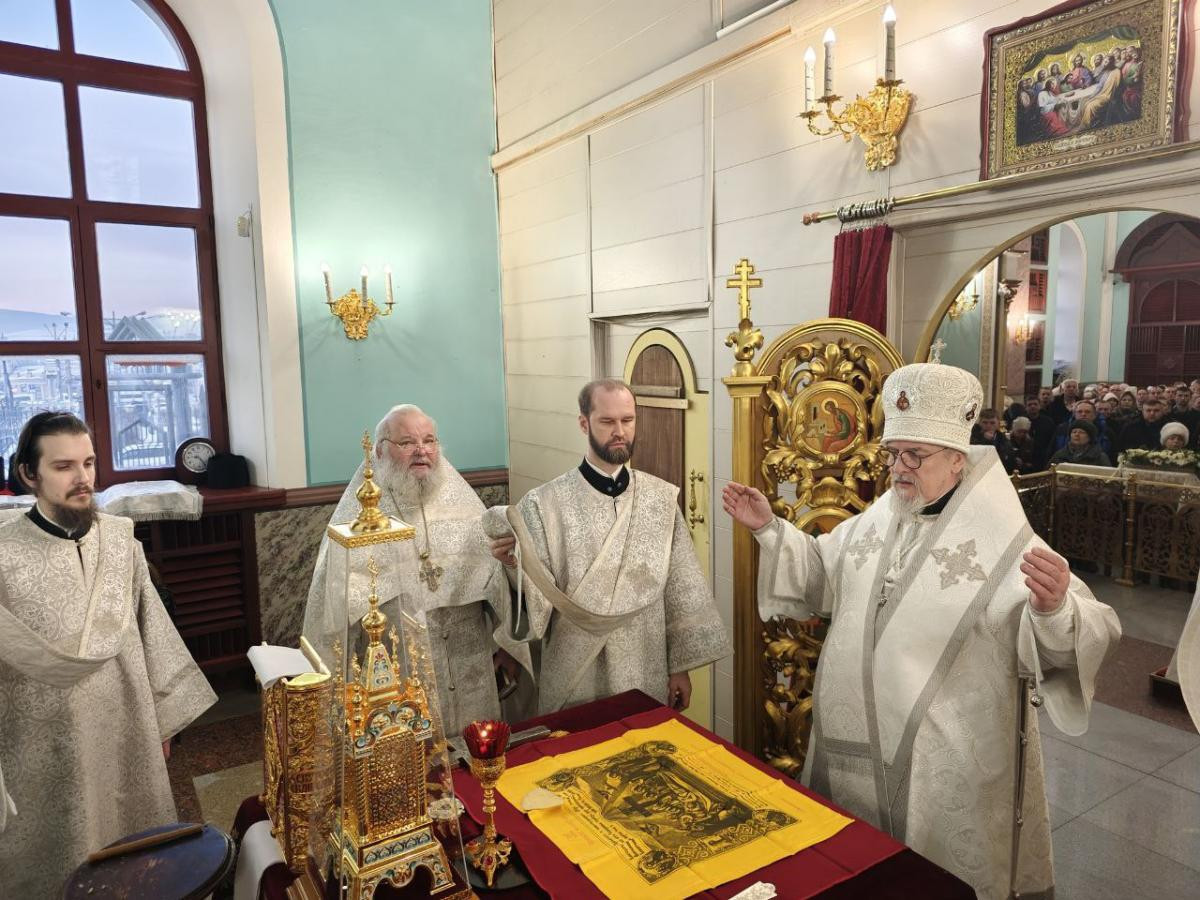 Его Высокопреосвященству сослужили: клирики Казанского кафедрального собора г. Читы протоиерей Андрей Федотов и протоиерей Михаил Андрусь; насельник Успенского мужского монастыря г. Читы иеромонах Феофан (Груша).