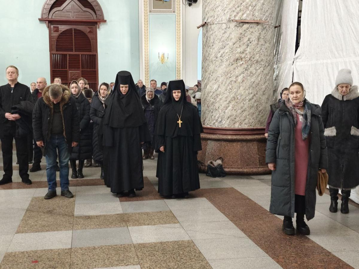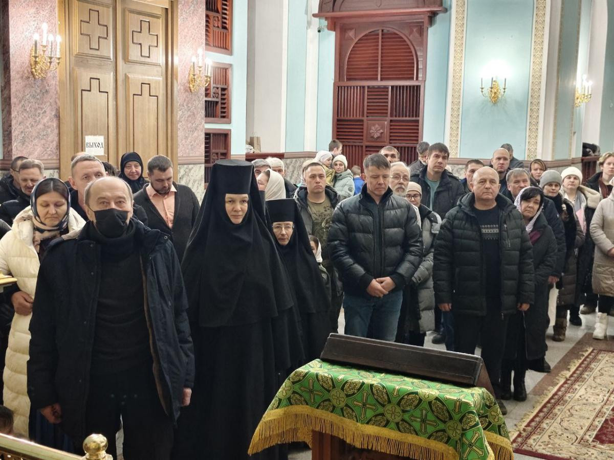 За богослужением молилась игумения Ольга (Василькова), настоятельница женского монастыря Всех святых, в земле Российской просиявших, пгт. Атамановка Читинского района и сестры обители.